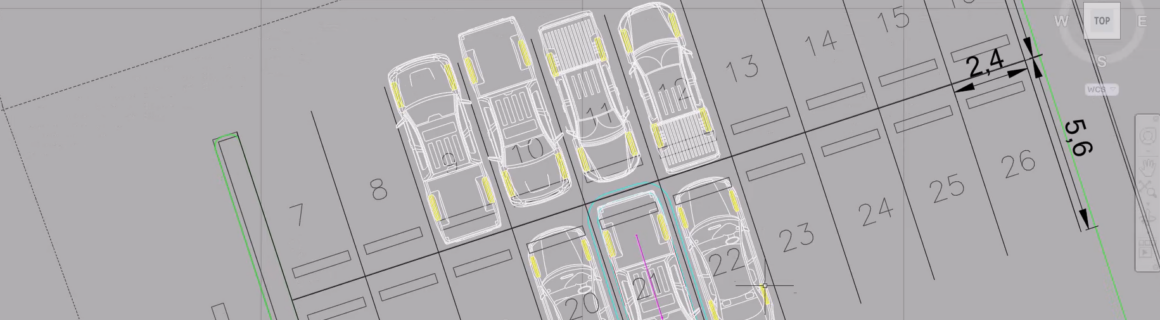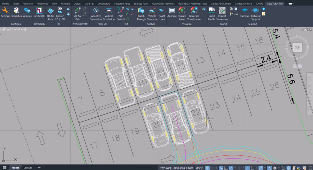 Australia is experiencing a surge in larger vehicles, including SUVs, dual-cab utes, and American-style “pickup trucks.” In response, proposals have been made to increase standard parking bay lengths from 5.4 m to 5.6 m. While these longer bays will better accommodate bigger vehicles, they raise concerns about reduced overall parking capacity, the environmental impact of expanded paved areas, and equity, as only a small portion of vehicles currently exceed existing standards.Figure 1. How supersizing cars can impact the current standard parking lot sizes demonstrated in AutoTURN Pro