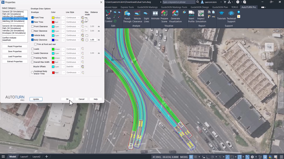 The recent update introduces dual turn lane assessment, developed by Main Roads Western Australia, to optimize lane composition. By analysing turning vehicle volume, heavy vehicle percentage, and their lane distribution, designers can determine which lane should accommodate a design heavy vehicle and whether the adjacent lane should serve a single-unit truck or passenger car, improving safety and efficiency.Figure 2. Dual turn lanes demonstrated in AutoTURN Pro