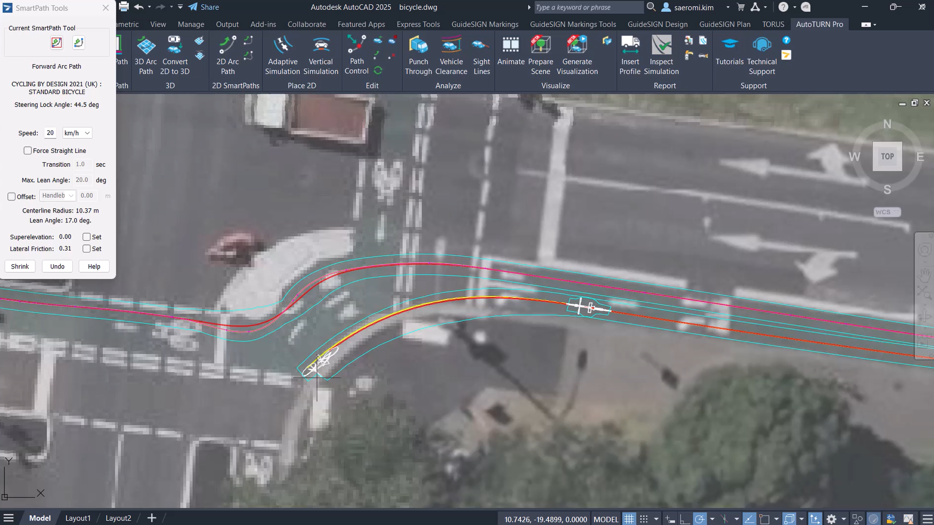 Polling during the webinar indicated a strong appetite among our attendees for clearer Austroads guidance on designing for vulnerable road users, including cyclists and e-scooters.This highlights the importance of supplementary tools and non-motorised design vehicles to create safer, more inclusive infrastructure. Tools like AutoTURN Pro enable engineers to simulate real-world conditions for both motorised vehicles and emerging non-motorised modes. For bicyclists, the importance of body clearances and the need to account for bicycle lean angles and “rider boxes” are imperative when designing safe, effective infrastructure for all road users.Figure 3. Bicycle simulation demonstrated in AutoTURN Pro